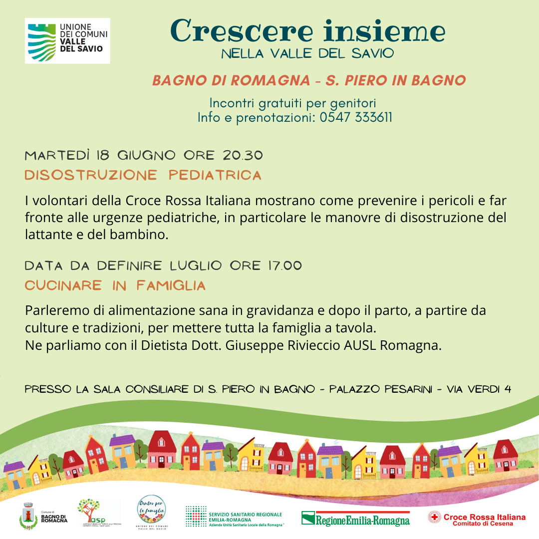 Martedì 7 maggio ore 20.30: Disostruzione pediatrica. I volontari della Croce Rossa Italiana mostrano come prevenire i pericoli e far fronte alle urgenze pediatriche, in particolare le manovre di disostruzione del lattante e del bambino. Il luogo del corso verrà comunicato agli iscritti